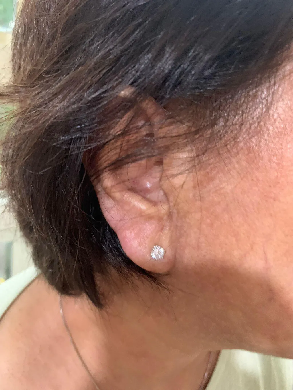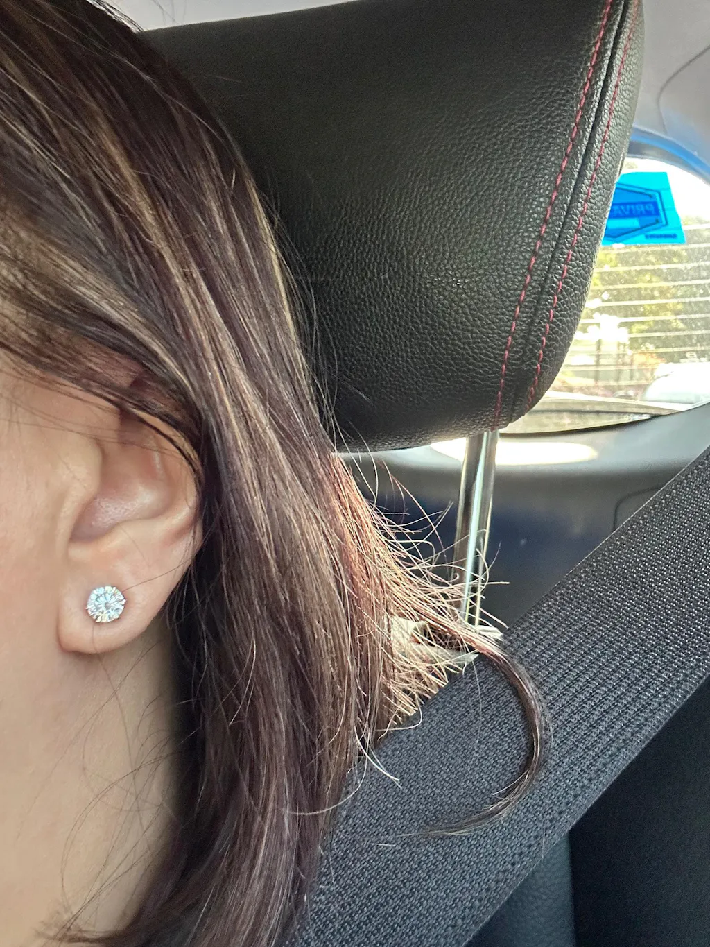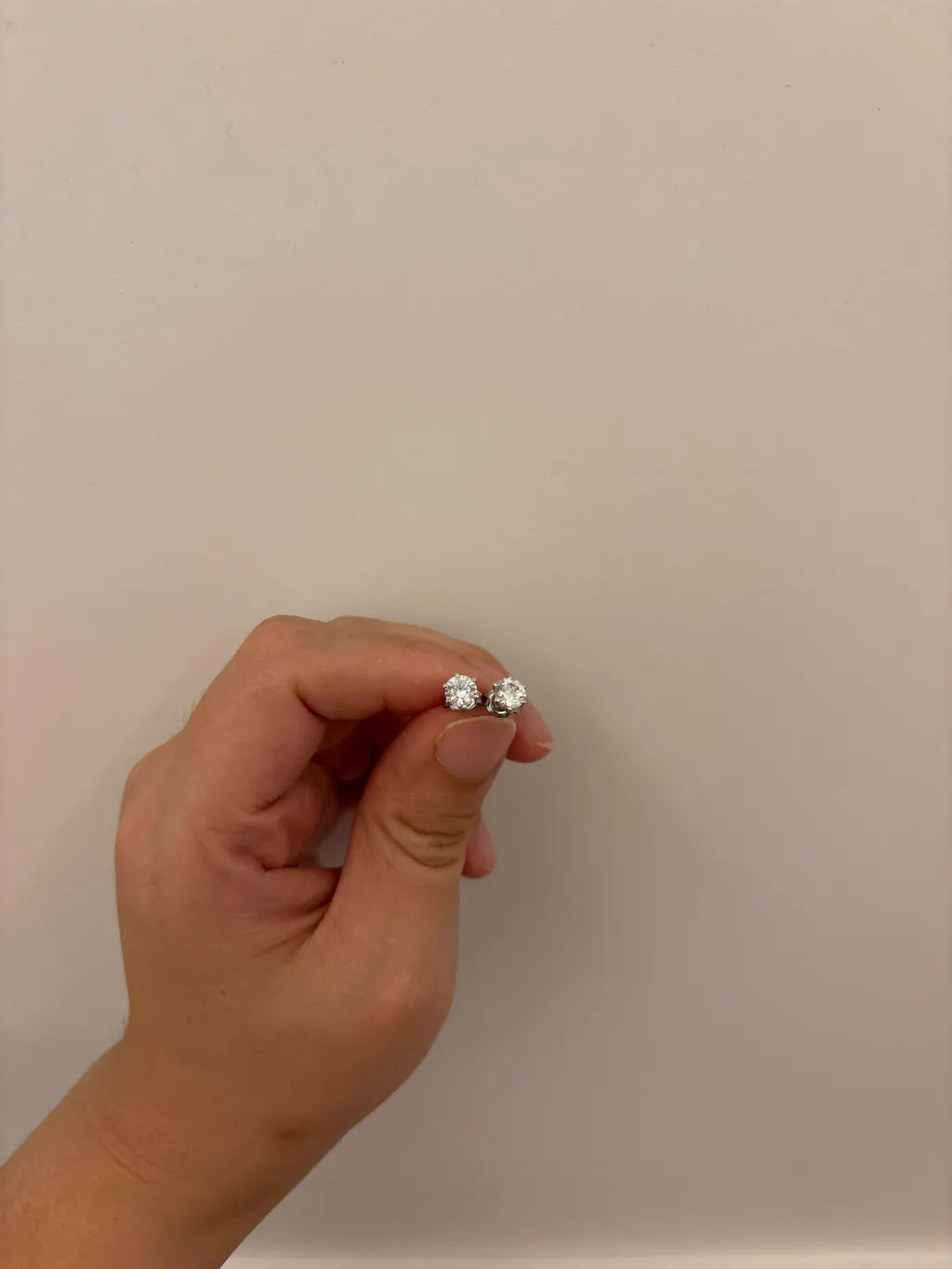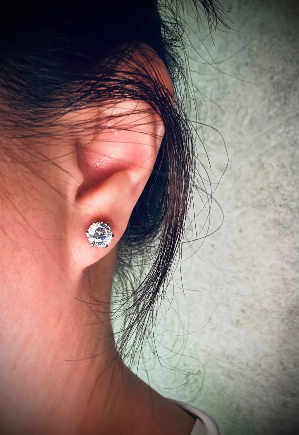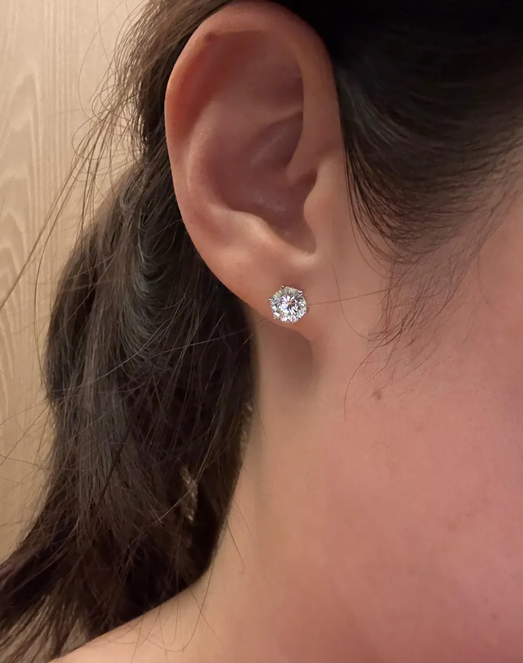 From left to right, the model is wearing the 6 Prong Round Solitaire Ear Studs in 0.5ct and 1ct respectively.