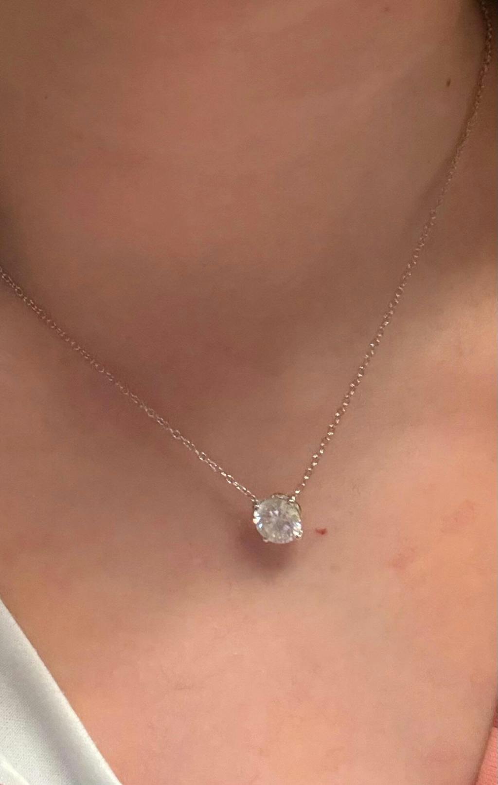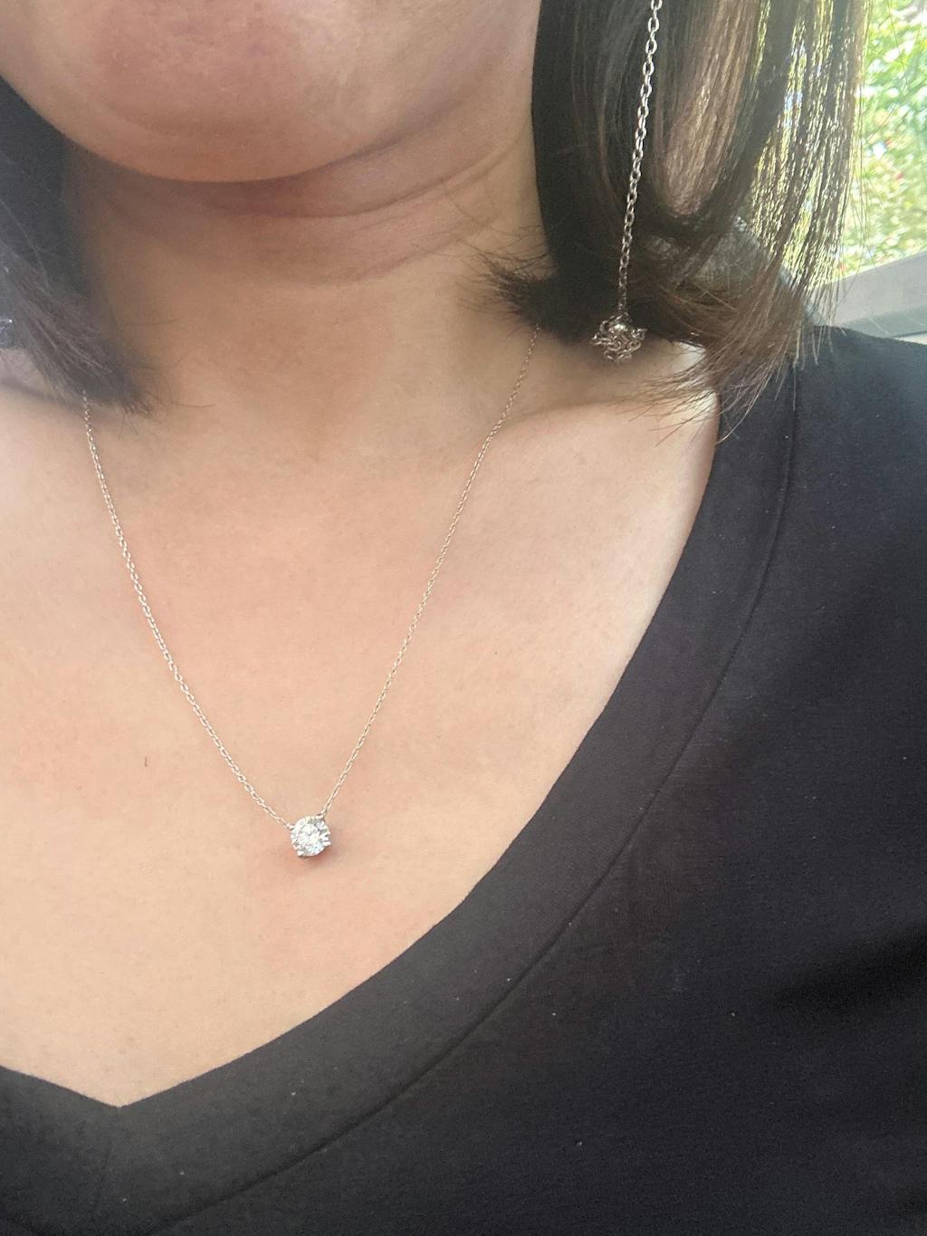 From left to right, the model is wearing the Round Solitaire Necklace in 1CT and 2CT respectively.