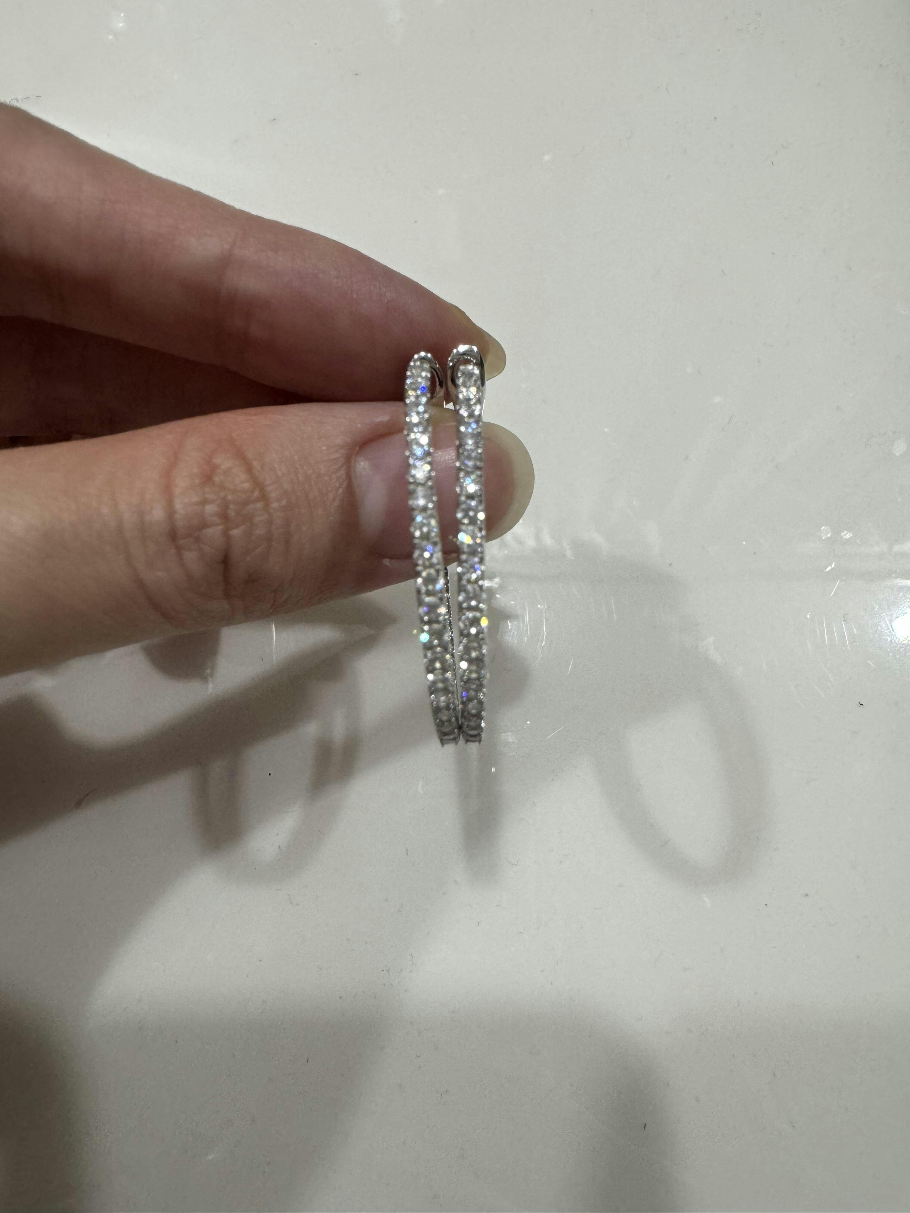 A luxurious upgrade with a brilliant array, our hooped earrings are versatile pieces that add a touch of glamour and radiance to any ensemble. Cradled within a minimal setting, each stone is meticulously placed inside and out to create a captivating play of light.