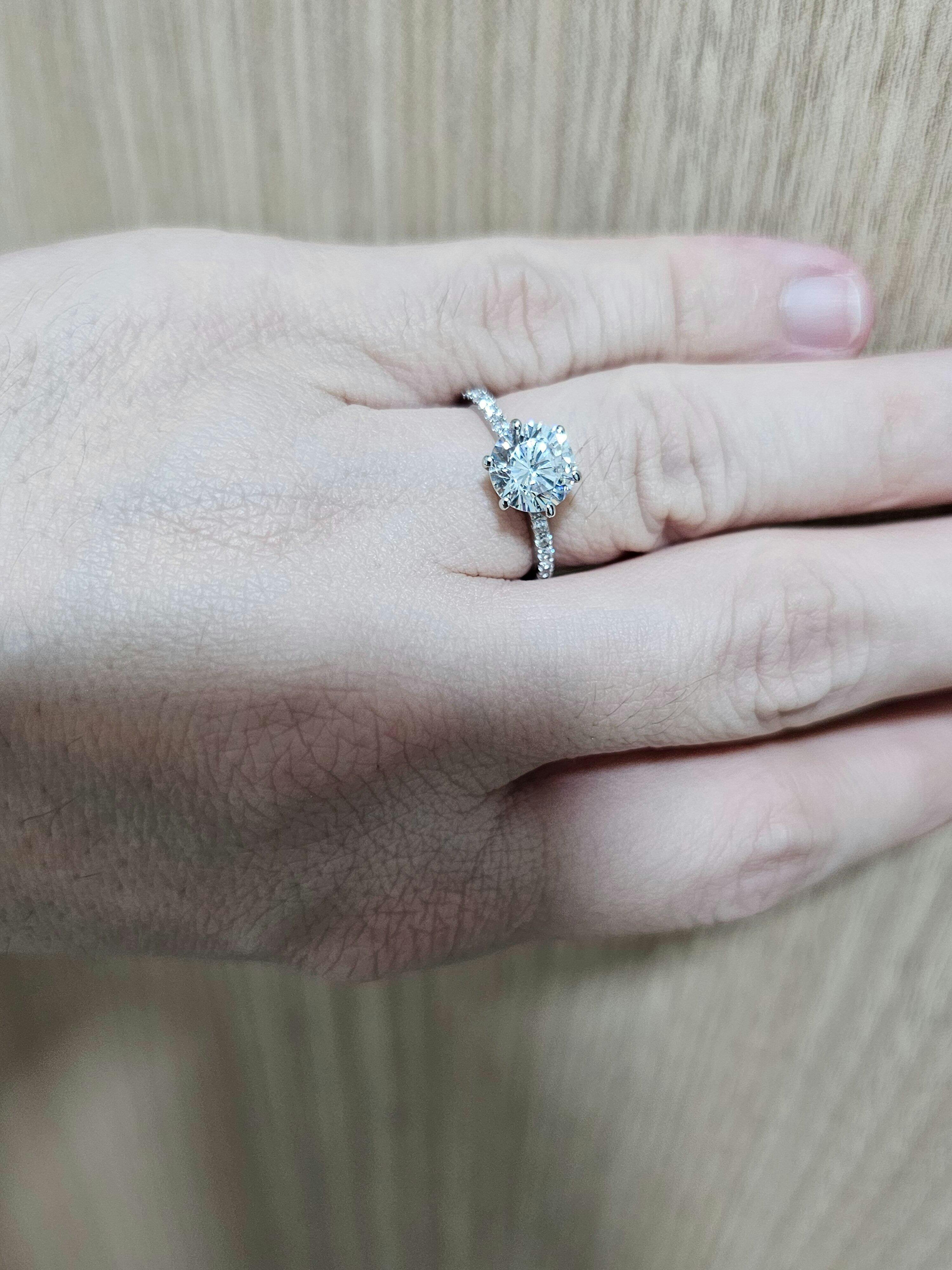 Alluring and exquisite, the thin pavé set stones beautifully cradles the round centre stone. Incredibly elegant, this simple setting allows a generous amount of light entering through the sides for maximum sparkle.